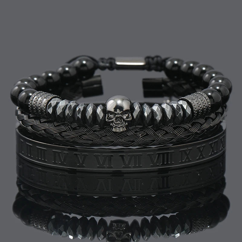 Black Stone Hematite Beads Men Skull Crown Leopard Head Handmade Bracelets Enamel Roman Bangles Hiphop Pulseras Jewelry