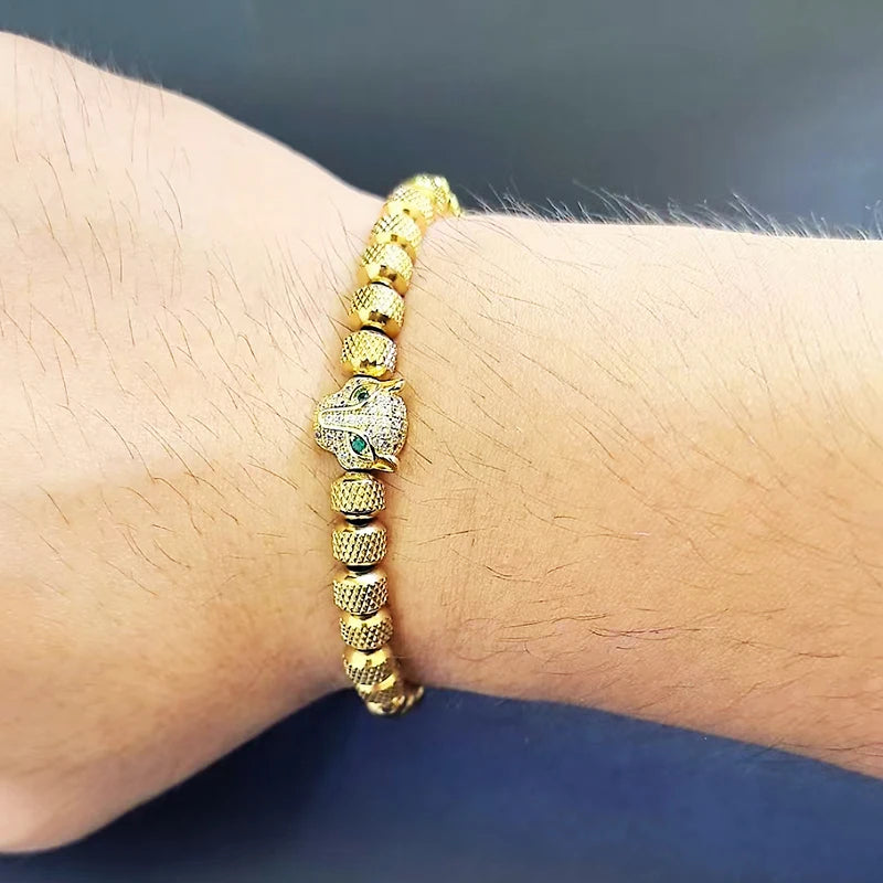 Luxury Royal Black Leopard Head Man Bracelet Stainless Steel Beads Hand Jewelry Big Boy Gift